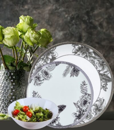 Hver del er laget av porselen av høyeste kvalitet, dekorert med håndmalte detaljer og en raffinert platinakant med diskret geometrisk mønster. Resultatet er et servise som kombinerer moderne eleganse med klassisk håndverk – perfekt både til hverdags og fest.