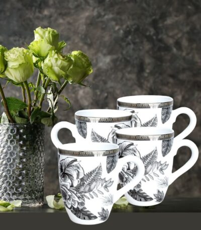 Håndtegnede blomster og blader slynger seg elegant rundt formene, mens den geometriske platinumkanten tilfører en subtil glød og eksklusiv finish.